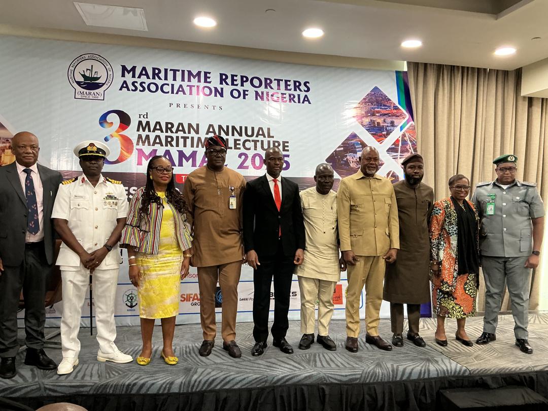 L-R: Secretary General, Abuja MoU, Capt. Sunday Umoren; Director, Regulatory Services, Nigerian Shippers’ Council (NSC), Mrs. Margaret Ogbonna; Deputy Director, Reform Coordinating, Strategic Management/ Blue Economy, NIMASA, Mr. Victor Illo; Special Adviser (Media) to the Minister of Marine and Blue Economy, Dr. Bolaji Akinola; President, Maritime Reporters’ Association of Nigeria (MARAN), Mr. Godfrey Bivbere; Chairman, Starzs Marine and Engineering Company Limited, Engr. Greg Ogbeifun; Special Adviser (Special Duties) to the Minister of Marine and Blue Economy, Mr. Funbi Adesokan; Chief Executive Officer, Le Look Bags, Mrs. Chinwe Ezenwa; and Assistant Controller, Western Marine Command, Nigeria Customs Service, CC Oputa; during the 3rd MARAN Annual Maritime Lecture (MAMAL) in Lagos on Wednesday.