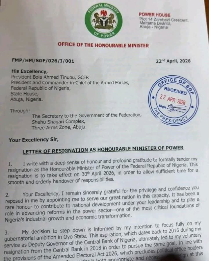 In a resignation letter dated April 22, 2026, and addressed to President Bola Ahmed Tinubu, Adelabu stated that his exit will take effect from April 30, 2026, to allow for a smooth transition of responsibilities. The letter was routed through the Office of the Secretary to the Government of the Federation.